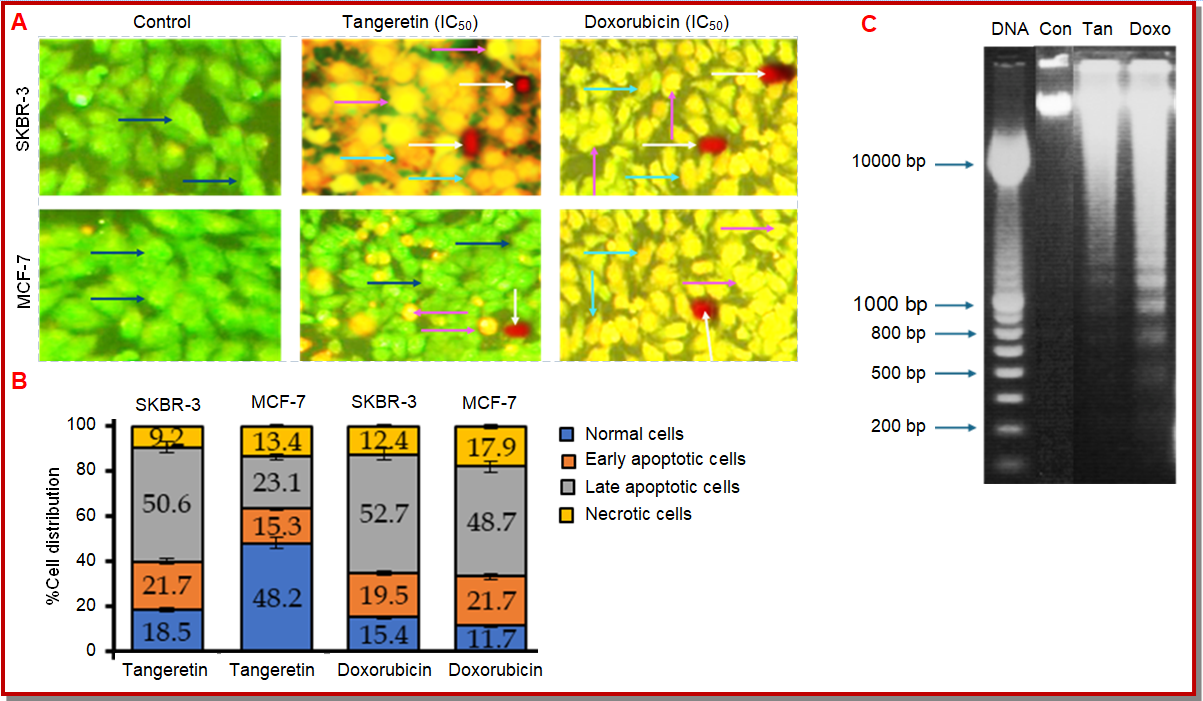 Figure 3: Representative fluorescence micrographs showing EB/AO-stained SKBR3 and MCF-7 cells after tangeretin and doxorubicin treatment. Arrows indicate viable (blue), early apoptotic (pink), late apoptotic (white), and necrotic (light blue) cells (A); Quantitative bar graph representing the percentage distribution of normal, early apoptotic, late apoptotic, and necrotic cells in each treatment group (B). Data are expressed as mean ± SD (n = 3); Representative image of DNA fragmentation analysis of SKBR3 cells. Cells treated with tangeretin (IC₅₀) and doxorubicin (10 µM) were subjected to agarose gel electrophoresis (C). DNA: DNA ladder; Tan: Tangeretin; Doxo: doxorubicin