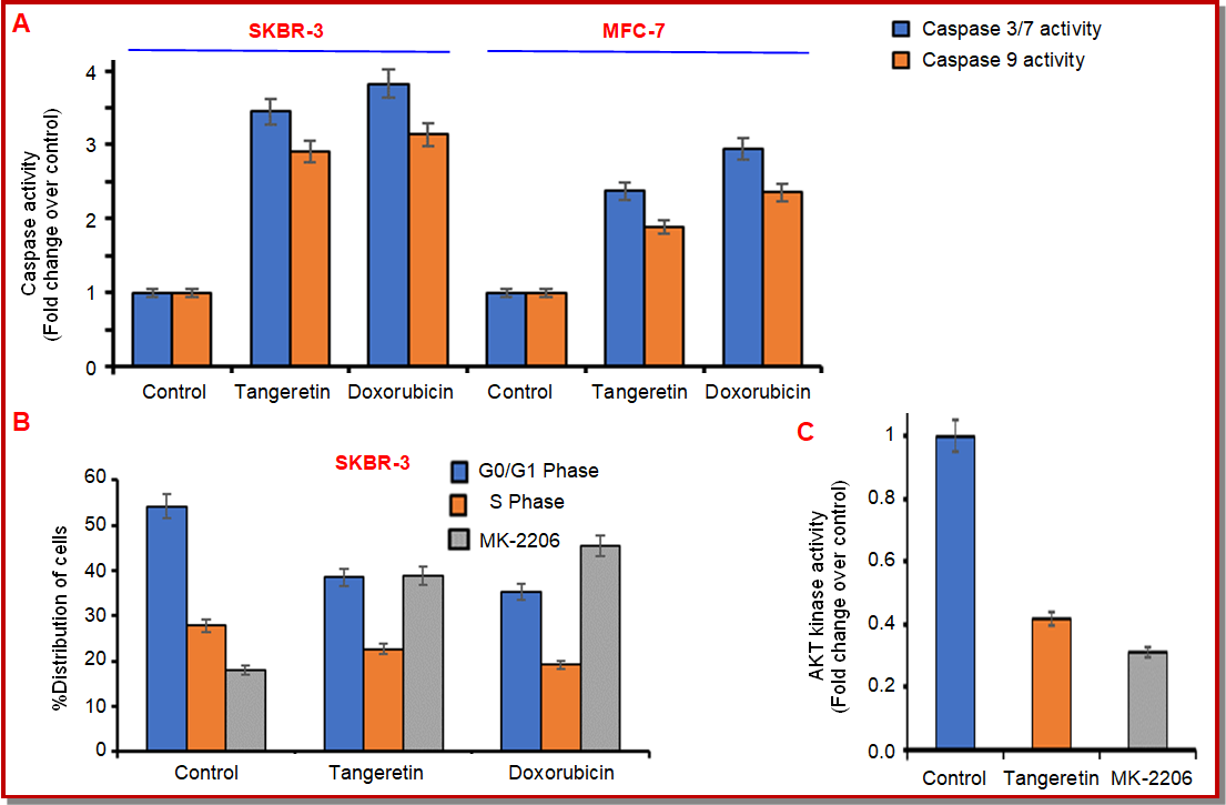 Figure 4: Quantitative analysis of caspase-3/7 and caspase-9 activities in SKBR3 and MCF-7 breast cancer cells after 24-hours treatment with tangeretin at their respective IC₅₀ concentrations: 19.5 µM for SKBR3 and 36.2 µM for MCF-7 and doxorubicin (10 µM). Untreated cells were used as controls (control). Caspase-3/7 and caspase-9 activities were measured using luminescent and fluorometric assay kits, respectively, and expressed as fold-change over the control (A); Effects of tangeretin and doxorubicin on cell cycle distribution in SKBR-3 breast cancer cells. The cells were treated with tangeretin at its IC50 concentration of 19.5 µM or doxorubicin (10 µM) for 24 hours and stained with propidium iodide for flow cytometry. The percentage distribution of cells in the G₀/G₁, S, and G₂/M phases was determined using FlowJo software (B). Effect of tangeretin and MK-2206 on AKT kinase activity in SKBR-3 breast cancer cells. The cells were treated with tangeretin at its IC50 concentration of 19.5 µM or MK-2206 (5 µM) for 24 hours. AKT activity was measured using a cell-based ELISA to quantify GSK-3α/β phosphorylation at Ser21/9; The results are expressed as fold changes relative to those of the untreated control (C). Data are the mean ± SD of three independent experiments