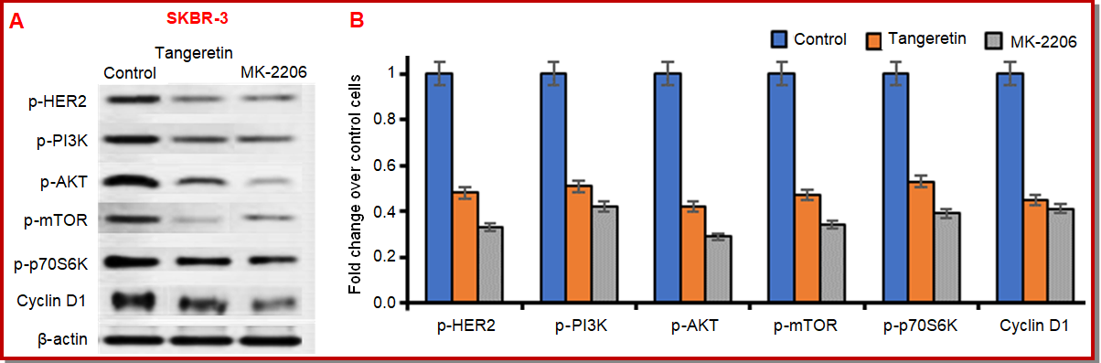 Figure 5: Representative western blot images showing the expression of phosphorylated HER2 (p-HER2), PI3K (p-PI3K), AKT (p-AKT), mTOR (p-mTOR), p70S6K (p-p70S6K), and cyclin D1 in SKBR3 cells treated with vehicle control (DMSO), tangeretin at its IC50 concentration of 19.5 µM or MK-2206 (2 µM) for 24 hours. β-actin was used as the internal loading control (A); Densitometric quantification of the protein bands in the panel, expressed as fold change relative to control and normalized to β-actin (B). The data represent the mean ± SD of three independent experiments (n = 3). p<0.05, vs. control; statistical analysis was performed using one-way ANOVA followed by Tukey’s post-hoc test