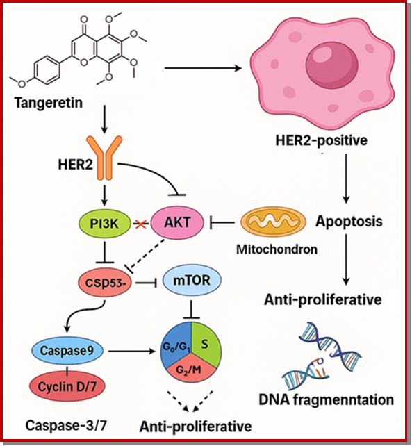 This study investigates the antiproliferative and pro-apoptotic effects of tangeretin on HER2-positive breast cancer cells, emphasizing the suppression of the PI3K/AKT/mTOR pathway and the induction of caspase-dependent apoptosis. These mechanistic insights high-light tangeretin's potential as a phytotherapeutic agent or adjuvant treatment for HER2-driven breast cancer.