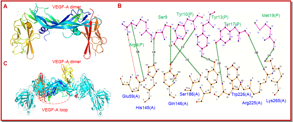 Figure 1: The VEGFR1 protein interacts structurally with CRT2. VEGF-A and VEGFR1 interact (A). The VEGF-A dimer's complex structure with VEGFR1-D1-D6 (B). The CRT2 peptide binds to an overall amino acid in the VEGFR1 site (C). Pymol and LigPlot+ were used to visualise the docking complex. Various ligands that contain CRT2, denoted by green or red hues respectively