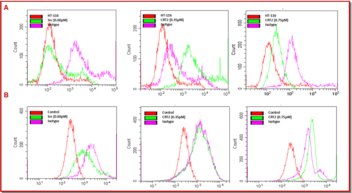 Figure 3: HT-116 cells were coupled with either FITC-scr peptide (0.60 μM) or FITC-CRT2 peptide (0.35 and 0.75 μM) for a predefined amount of time (green curve). The auto fluorescence of the cells is represented by a pink curve (A). HT-116 was exposed to different concentrations of scr peptide (0.60 μM) or CRT2 peptide (0.35 and 0.75 μM) for an entire night in the dark (green curve) (B)