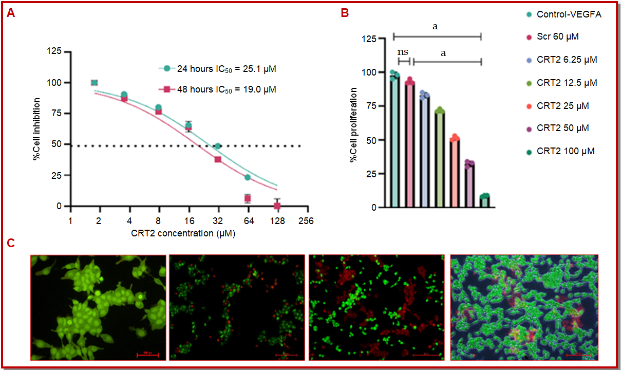 We chose the in vitro cell model to study the cytotoxic effects of CRT2 on colorectal cancer VEGFR1+ HT-116 cell lines. These were exposed to varying doses of CRT2 for 24 to 48 hours. CRT2 effectively stopped the proli-feration of colorectal cancer cell lines (Figure 4A-B). The half-maximum inhibitory concentration (IC50) of CRT2 for HT-116 cells was 16.0 ± 1.3 μg/mL, respectively. The CRT2 peptide demonstrated a broad spectrum of cell inhibition in a dose- or time-dependent manner in several colorectal cancer cell lines. The peptide contains six positively charged residues that make up a CRT2 peptide, which is soluble in water. One side of the helix, methionine (W), is hydrophobic, and the other side of the helix, h, is polar and hydrophilic amino acids. This is where the CRT2 peptide is located. It is known that these cationic amphipathic peptides can cause membrane instability and cause cancer cells to die. It had been discovered that peptides containing serine caused cell cycle arrest and apoptosis. Phase-contrast microscopy was used to analyze the morphology of selective CRT2 in human colon cancer cell lines. Green light was emitted by living, viable cells, orange-yellow light was emitted by early apoptotic cells, and red light was emitted by late apoptosis or DNA-fragmented cells (Figure 4C). CRT2-treated colorectal cancer cells exhibited an increase in HT-116 apoptosis. Data were synchronized with the MTT.