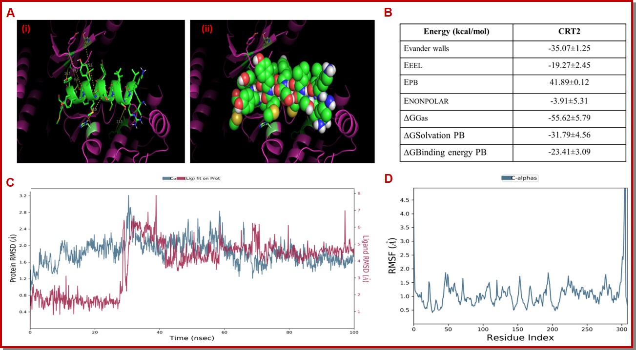 Under physiological conditions, the stability of the VEGFR1-CRT2 interactions had been validated by molecular dynamics simulation and docking experiments. According to hydrogen bond studies, CRT2 was mostly supported by polar contacts with water mole-cules and forms hydrogen bonds principally with Glu-59, with a high occupancy value. The molecular docking, CRT2, was able to fit into the VEGFR1 kinase domain pocket with the assistance of seven front and five rear water molecules (Figure 2A (i and ii)). Using all of the default settings from Amber's MMPBSA module, the binding free energies of CRT2 were calculated over the previous 2 nsec simulation frames using the Molecular Mechanics Poisson-Boltzmann Surface Area (MMPBSA) technique (Figure 2B). These findings imply that the electrostatic and van der Waals interactions contribute to the energetically favorable conformational stability of VEGFR1-CRT2. All-atom molecular dynamics simulation research was done on the docked complex to obtain more mechanistic insights into the binding behavior of CRT2 with VEGFR1.