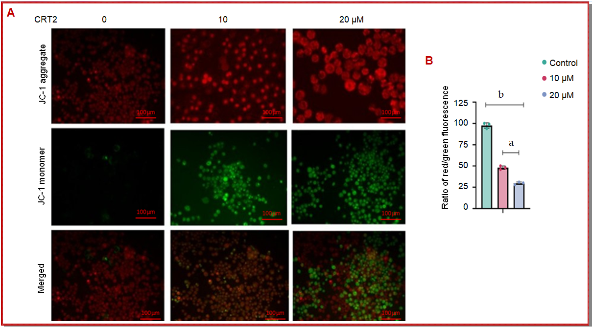 Anti-cancer properties of CRT2 peptide were further validated by this assay. The regulation of apoptosis was largely dependent on the cell apoptosis. JC-1, a monomer that exhibits green fluorescence at Em485 and Ex535 nm, was used in the MMP-sensitive fluorescent assay to evaluate MMP in the context of CRT2 therapy. In cells with greater mitochondrial potential, JC-1 fluorochrome accumulated within the mitochondrial membrane matrix to form JC-1 fluorochrome aggregation. It exhibited red fluorescence with values of Ex560 and Em595 nm (Figure 5). Due to monomer aggregates in the mitochondria, in this situation, which has low mitochondrial membrane potential, apoptotic cells or JC-1 fluorochrome continue to develop. Consequently, there is a red shift to a green shift in the fluorescence spectrum extension, a measure of mitochondrial depolarization. In both control and free drug-treated cells, the mitochondria displayed red fluorescence. This progression indicated active mitochondria. However, CRT2 treatment reduced mitochondrial integrity in a dose-dependent manner. In contrast to the control group, where CRT2-induced membrane depolarization resulted in loss of mitochondrial integrity, CRT2 therapy enhanced the accumulation of JC-1 monomer in cells. The image clearly illustrates the ratio of red to green fluorescence intensity, cell death, or damage in comparison to control clustered cells. When compared to control cells, CRT2 at 0, 10, and 20 µM displayed a 1.3-fold drop in mitochondrial membrane potential.