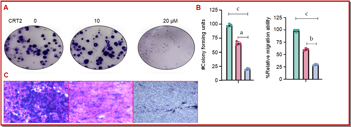 Figure 6: After pre-treating HT-116 cell lines with CRT2 peptide for 24 hours, the cells were plated at a density of 500 cells per well for 15 days to create colony forming pictures. Following the colonies' fixation and 0.5% crystal violet staining (A). Assay for Transwell invasion CRT2 0, 10, and 20 µg/mL were used to seed HT-116 cells in the upper chamber over a 24-hours period. Preserved, labelled, and counted the migrating cells in the lower chamber and images from three separate tests (B-C). With respect to the control group, data were mean ± SEM; n=5; ap<0.05, bp<0.01, and cp<0.0001; Magnification 40x