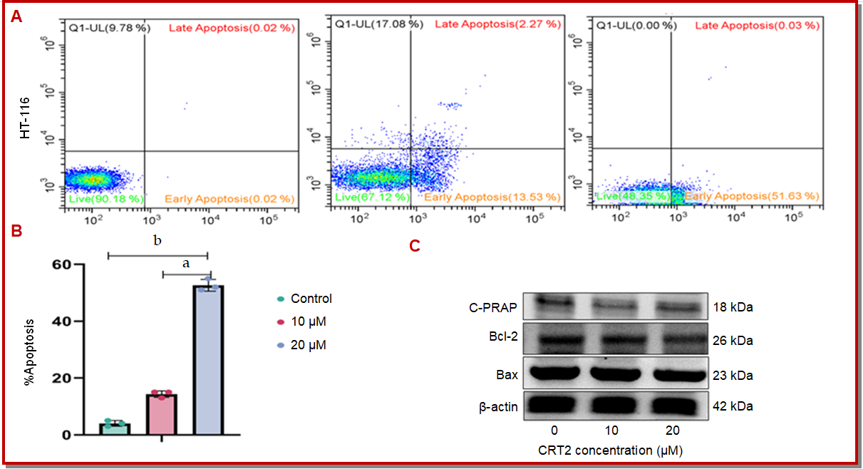 Figure 7: Effects of CRT2 on apoptosis (A-B) and proteins Bax/Bcl-2 (C) of HT-116 cells. With respect to the control group, data were expressed as mean ± SEM; n=5; ap<0.05; bp<0.01