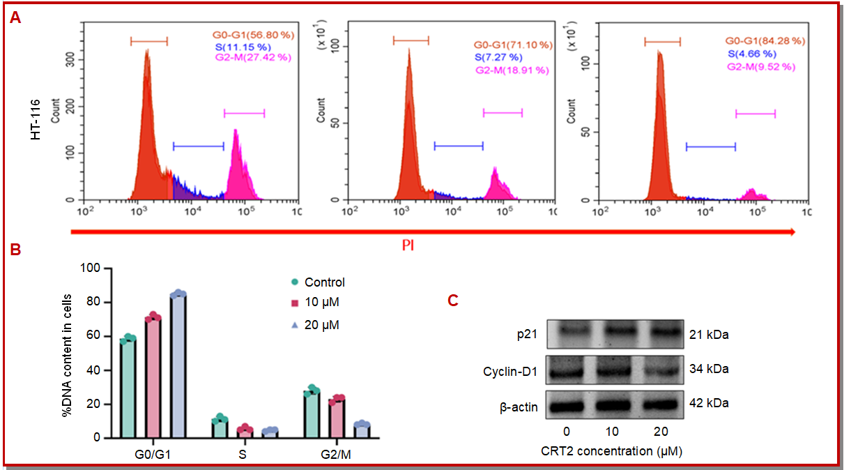 Figure 8: Effects of CRT2 on cell cycle analysis using flow cytometry analysis (A), DNA content (B), and cyclin-D/p21 proteins (C) in HT-116 cells. Data were mean ± SEM; n=5