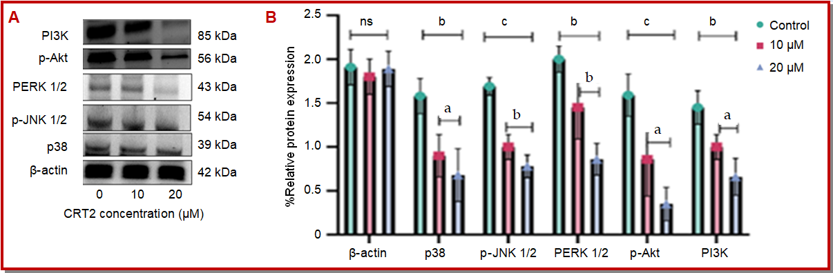 Figure 9: Western blot analysis showing the effect of CRT2 on the expression of p-MEK, p-ERK1/2, and p-Akt in HT-116 colorectal cancer cells (A). Densitometric quantification of p-MEK, p-ERK1/2, and p-Akt levels normalized to β-actin (B). Data were presented as mean ± SEM; n=5; ap<0.05; bp<0.01; cp<0.0001 vs. control