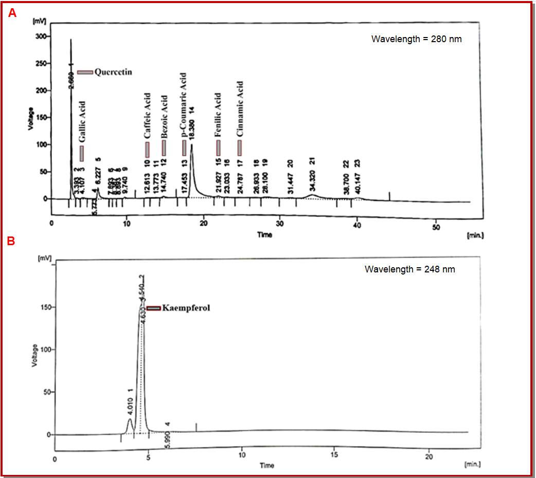 Figure 2: HPLC data of L. cylindrica leaf extract at two different wavelengths [upper peaks at 280 nm (A); lower peaks at 248 nm (B)] to visualize all compounds