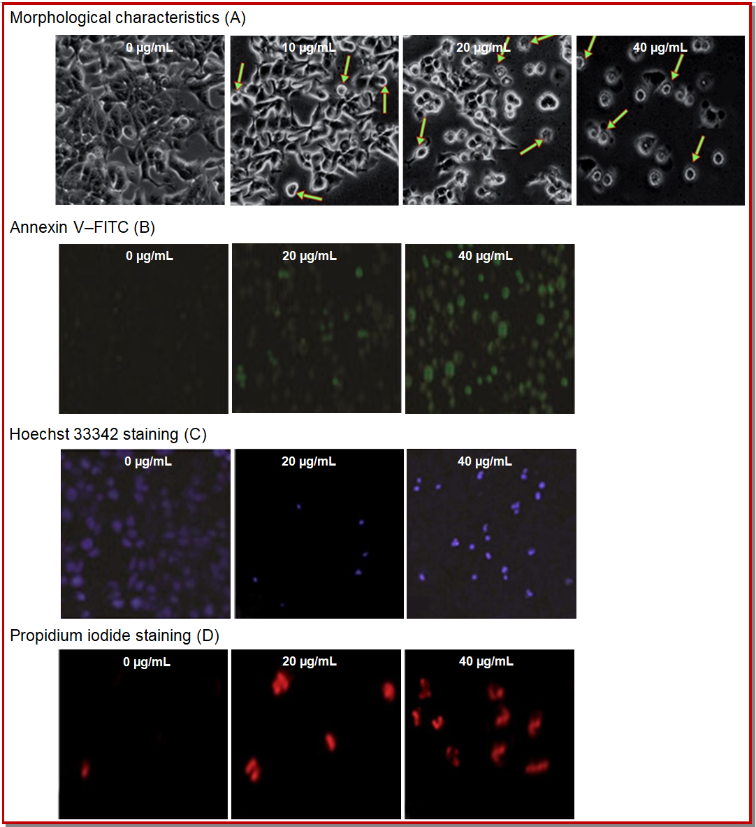 Figure 5: Apoptotic morphological characteristics (A), annexin V–FITC (B), Hoechst 33342 staining (C), and propidium iodide staining (D) of the MCF-7 cell lines were observed after 24 hour (48 hours in annexin V–FITC) exposure at 0, 10, 20, and 40 µg/mL concentrations of the L. cylindrica extract. Magnification 100x