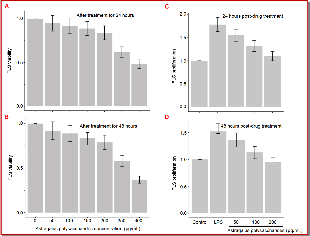 Figure 1: Effects of different concentrations of astragalus polysaccharides on fibroblast-like synoviocytes (FLS) viability after 24 hours (A) and 48 hours (B) of intervention. Effects of astragalus polysaccharides on LPS-induced proliferation of FLS after 24 hours (C) and 48 hours (D) of intervention; Data are mean ± SD; n=3; lipopolysaccharide (LPS)