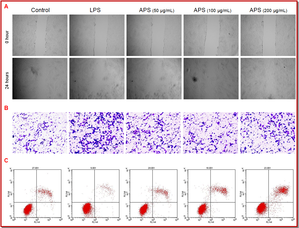 Figure 2: Effect of astragalus polysaccharides (APS) treatment on the migration abilities (A), invasion abilities (B) and apoptosis rate (C) in LPS-induced fibroblast-like synoviocytes (FLS); lipopolysaccharide (LPS)
