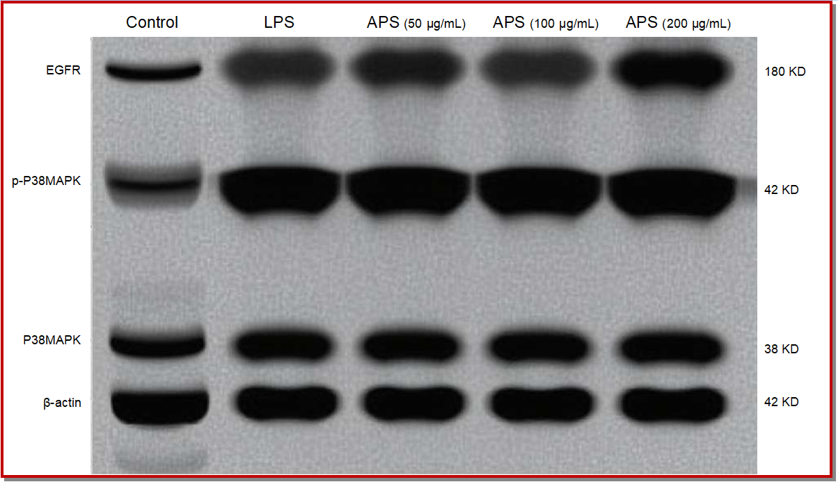 Western blot analysis revealed that, compared to the control group, the expression of EGFR was significantly upregulated in the LPS group (p<0.05). Similarly, the relative expression of p-P38MAPK/P38MAPK was significantly increased (p<0.05). However, astragalus polysaccharides treatment significantly downregulated both EGFR expression and the relative expression of p-P38MAPK/P38MAPK in FLS compared to the LPS group (p<0.05) (Figure 3).