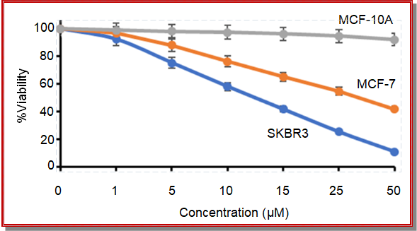 HER2-positive SKBR3, ER-positive MCF-7, and non-tumorigenic MCF-10A human mammary epithelial cells (ATCC origin; procured from CCMB, Hyderabad) were used in this study. SKBR3 cells were maintained in McCoy’s 5A medium supplemented with 10% fetal bovine serum (FBS) and 1% penicillin/streptomycin. MCF-7 cells were cultured in high-glucose DMEM containing 10% FBS and 1% penicillin–streptomycin. MCF-10A cells were grown in DMEM/F12 (1:1) supple-mented with 5% horse serum, EGF (20 ng/mL), hydrocortisone (0.5 µg/mL), cholera toxin (100 ng/mL), insulin (10 µg/mL), and 1% penicillin–streptomycin. All cultures were maintained in T-75 flasks at 37°C in a humidified 5% CO₂ incubator. Media were refreshed every 48–72 hours, and cells were subcultured at 70–80% confluence using 0.25% trypsin–EDTA. Experiments were performed using cells between passages 5 and 20 to ensure phenotypic stability.