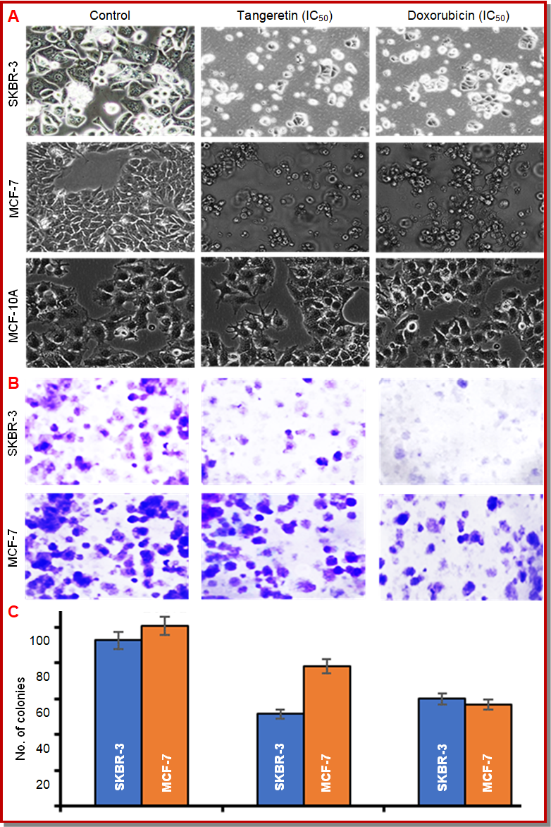 Figure 2: Morphological changes were observed in SKBR3, MCF-7, and MCF-10A cells after 24-hours of treatment with tangeretin at their respective IC50 concentrations: 19.5 µM for SKBR3, 36.2 µM for MCF-7, and 327.5 µM for MCF-10A. Images were captured using phase-contrast microscopy at a magnification of 20x (A). Effect of tangeretin and doxorubicin on the clonogenic survival of SKBR3 and MCF-7 cells; Representative images of crystal violet-stained colonies in SKBR3 and MCF-7 cells treated with vehicle (control), tangeretin at their respective IC₅₀ concentrations: 19.5 µM for SKBR3 and 36.2 µM for MCF-7, or doxorubicin for 14 days (B); Quantitative colony counts expressed as mean ± SD (n = 3) (C)