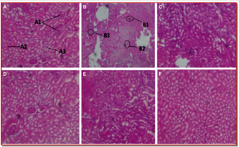 Figure 1: Light photomicrograph of kidney tissue of rats treated with methanol extract of Berberis lycium in subacute study. Haematoxylin and eosin, X 400 A: Control kidney, A1: Glomerulus, A2: Proximal tubule, A3: Distal tubule, B: Cisplatin 4 mg/kg, B1: Peritubular congestion, B2: Coagulative necrosis, B3: Degeneration, C: AE-200, D: AE-400, E: CIS + AQ200, F: CIS + AE400