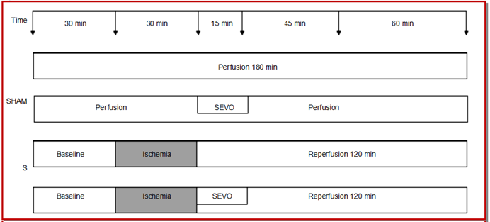 A total of 32 hearts in the successfully prepared in vitro model were divided into 4 groups as follows (n=8)(Figure 1): Sham surgery group (SHAM group), simple sevoflurane group (S group), simple ischemia-reperfusion group (I/R) group), and sevoflurane postconditioning group (SEVOP group). (1) SHAM group: Continuous K-H buffer perfusion for 180 min; (2) S group: Continuous K-H buffer perfusion for 60 min followed by perfusion of K-H buffer containing 2.5% sevoflurane (lot number: 2217; Maruishi Pharmaceutical, Japan) at 60 min for 15 min and then perfusion of K-H buffer for 105 min; (3) I/R group: Balance for 30 min, ischemia for 30 min, and reperfusion for 120 min; and (4) SEVOP group: Perfusion of K-H containing 2.5% sevoflurane for 15 min during the early stage of reperfusion.