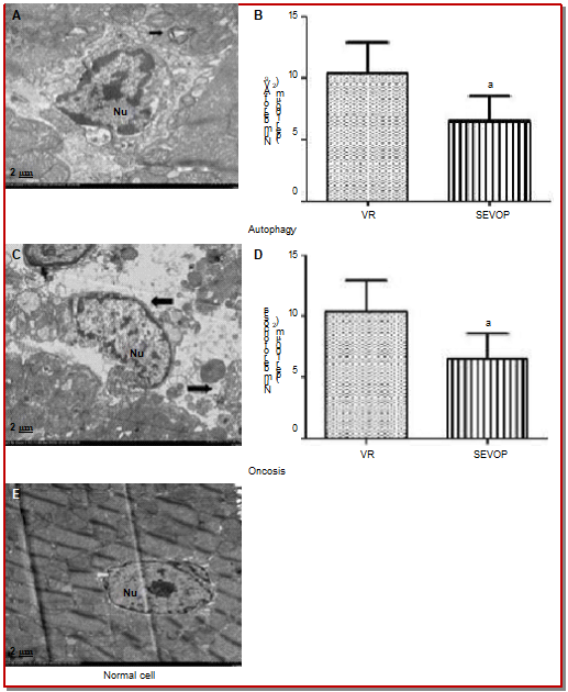 (A) Autophagic vacuoles are a vesicular structure with a double-layer or single-layer membrane, cytoplasm, and organelle components (×2000 magnification, bar=2 am, shown by the arrow). (B) Comparison of the numbers of autophagic vacuoles between the two groups. (C) Oncosis results in cell swelling, increased volume, cytoplasmic vacuoles, endoplasmic reticulum swelling, significant reduction of cristae, and formation of electronic transparent areas. (D) Comparison of the numbers of oncotic cells. (E) Cells in the sevoflurane preconditioning group. Autophagic vacuoles and oncotic cells in all groups were quantitatively analyzed. After one-way analysis of variance, the Student-Newman-Keels method was used to compare the mean values among multiple samples (n = 5).
