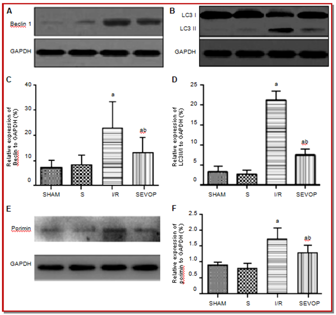 The Beclin-1 level in the SEVOP group was lower than the level in the I/R group, indicating that sevoflurane postconditioning in the ischemia-reperfusion group down-regulated Beclin-1 protein expression Alternatively, sevoflurane postconditioning may have promoted autophagy functions to increase Beclin-1 clearance, thereby reducing the Beclin-1 protein expression level (Figure 3A and C).