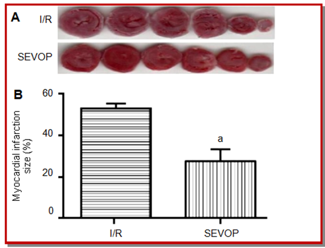 Myocardial I/R caused myocardial infarction. Sevoflurane postconditioning reduced the infarction range. (A) Comparison between the I/R and SEVOP groups. After TTC staining, the results were analyzed using the Alpha View gel image analytical software. (B) The difference compared with the I/R group was significant (ap<0.05). I/R: Myocardial ischemia-reperfusion group; SEVOP: Sevoflurane postconditioning in the myocardial ischemia-reperfusion group