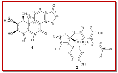 In the present study, 9-epi viridol (1) gave MIC values of 256 µg/mL against B. subtilis, S. aureus, MRSA and E. coli. Butyrolactone I (2) exhibited activities against Gram positive B. subtilits with a MIC of 128 µg/mL, and S. aureus, MRSA and E. coli with MIC’s of 256 µg/mL. At 256 µg/mL both compounds were inactive against the other bacteria and C. albicans tested.