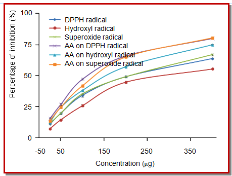Free radical scavenging activity was carried out on different free radicals like superoxide, hydroxyl and 2,2-diphenyl-1-picrylhydrazyl (DPPH) free radicals by comparing with the standard drug ascorbic acid (Rao et al., 2013; Rao et al., 2012). The extract was dissolved in at different concentrations in dimethyl sulfoxide for the study and the experiment was repeated thrice, results showed in mean ± SEM. The percentage inhibition was calculated as (Ao-A1)/A0 × 100.