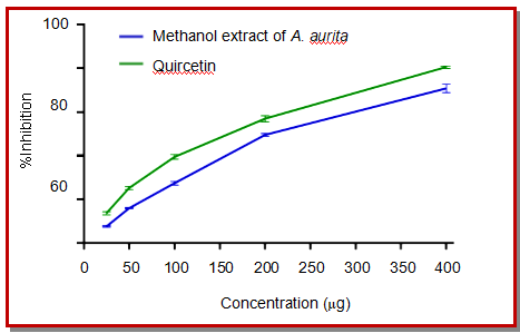 The effect of methanolic extract of A. aurita was assessed with aldose reductase enzyme using DL-glyceraldehyde as substrate and quercetin as standard drug (Figure 2). The extract showed dose-dependent inhibitory activity on aldose reductase enzyme. The extract showed the inhibitory activity almost along with quercetin. The IC50 values for methanolic extract of A. aurita and quercetin were found to be 163 and 212 µg respectively.
