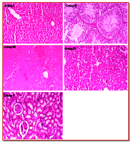 Figure 3: Histopathological changes of different groups' liver tissue in STZ-induced anti-diabetic activity. Group I- Control (Normal rats); Group II-Untreated diabetic; Group III- Normal rats treated with extract; Group IV-Diabetic rats treated with metformin; Group V-Diabetic rats treated with extract