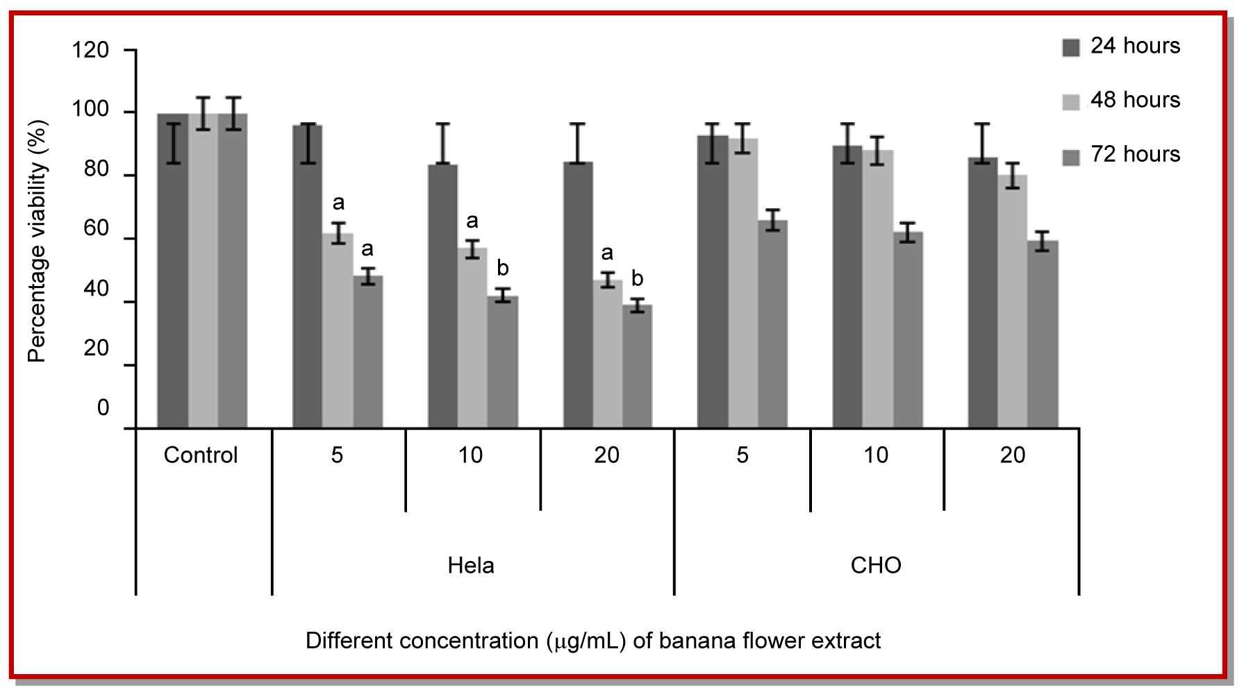 Figure 1: Effect of banana (Musa paradisiaca)flower ethanol extract on HeLa and CHO Cell Lines. ap<0.05 compared with control. bp<0.001 as compared to the control
