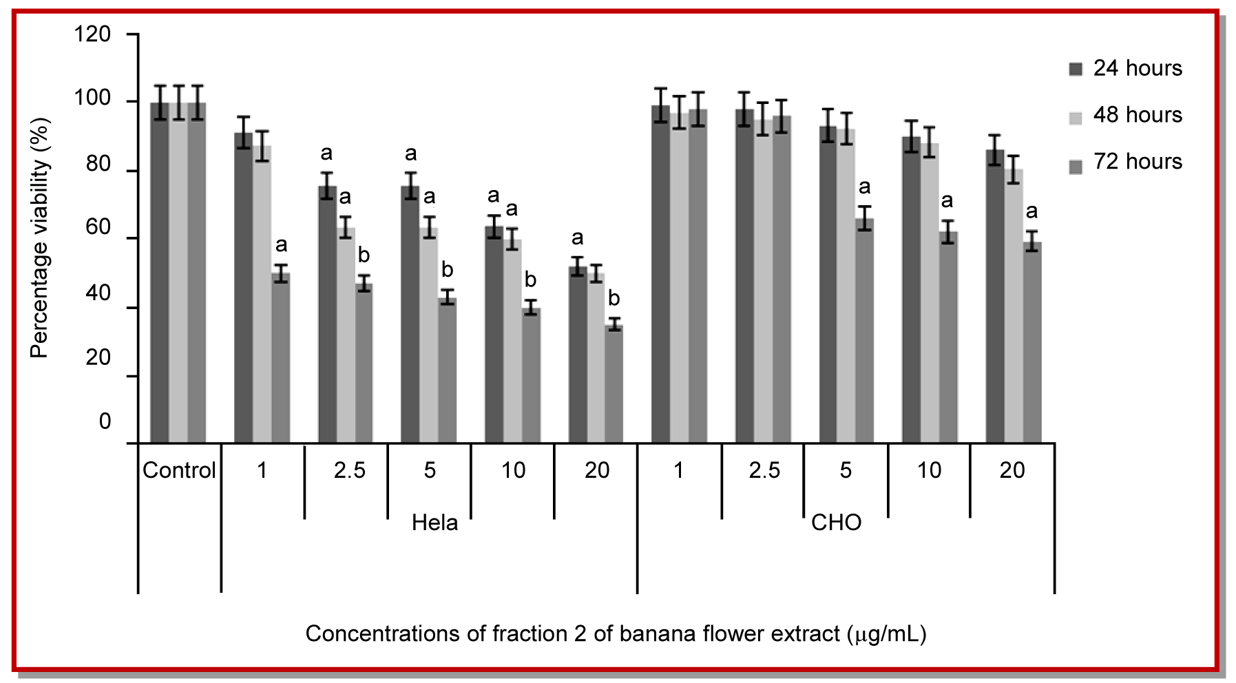Figure 2: Effect of bioactive fraction 2 of banana flower extract on HeLa and CHO cells for 24, 48 and 72 hours. ap<0.05 compared with control. bp<0.001 as compared to the control