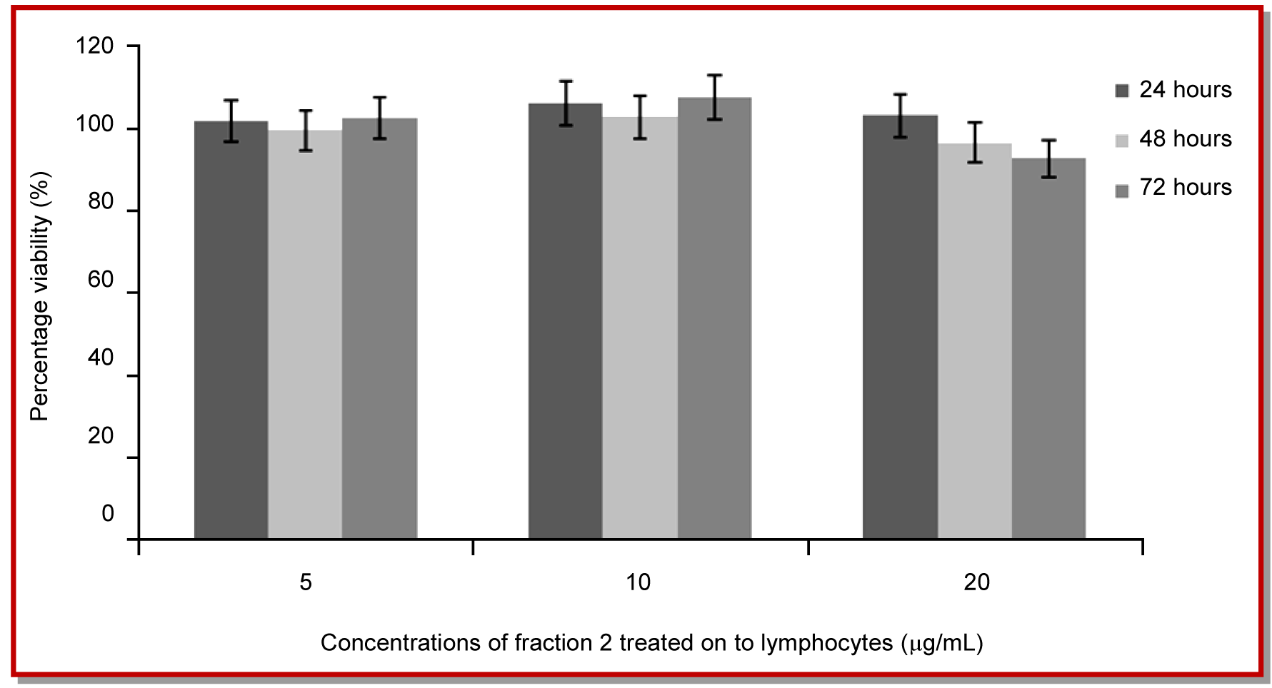 When the bioactive fraction 2 from the flower extract was checked for cytotoxicity on normal human peripheral lymphocytes, there was not much difference in the percentage viability at all the tested concentrations and at 20 µg/mL, the percentage viability was seen to be decreased to 92% at 72 hours, indicating that this fraction would be comparatively safer on humans (Figure 3).