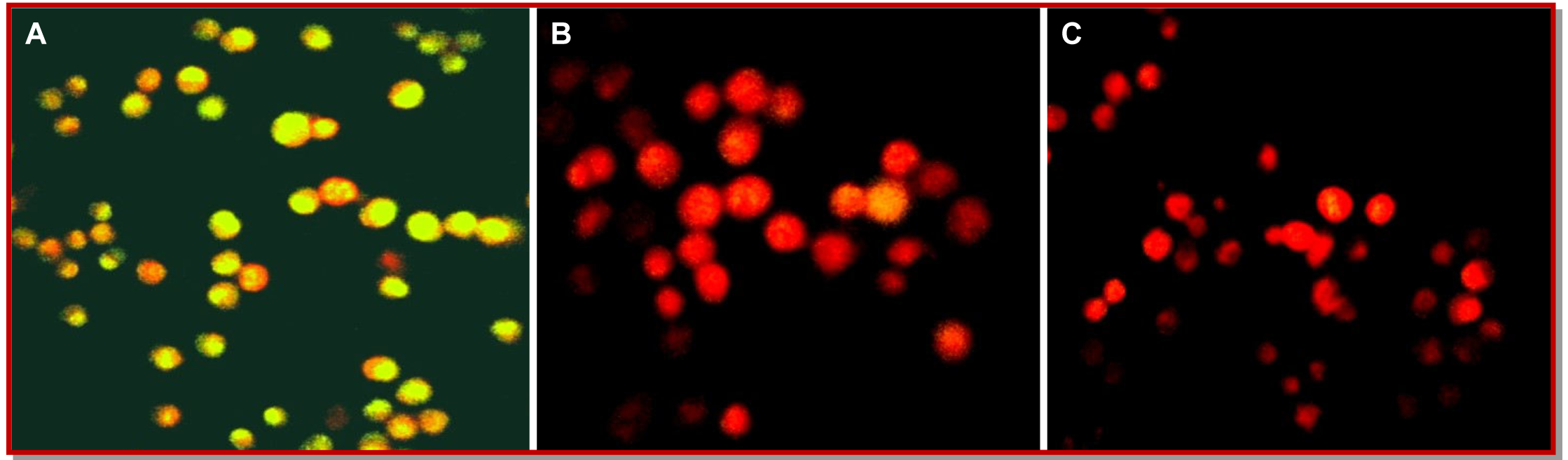 Fluorescence microscopic analysis by ethidium bromide/acridine orange (EB/AO) staining