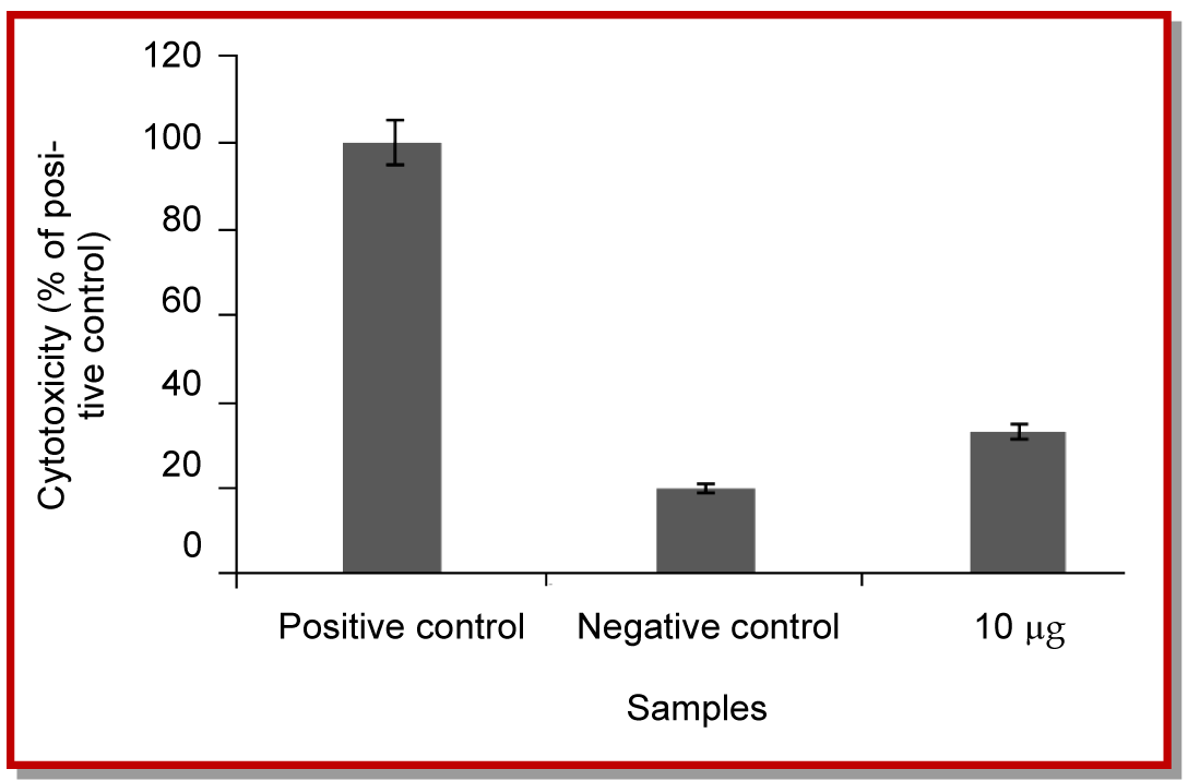 The cytotoxicity, as assessed by LDH release by the HeLa cells treated with 10 µg/mL of fraction 2 for 24 hours, was 32.8% (Figure 6) when compared with that of the positive control i.e., 1% Triton-X 100, which could induce all of the HeLa cell death through cytotoxic effects. This indicates that the bioactive fraction has released LDH when added to the HeLa cells, and LDH release assays are an appropriate and possibly preferable means of measuring cellular cytotoxic reactions.