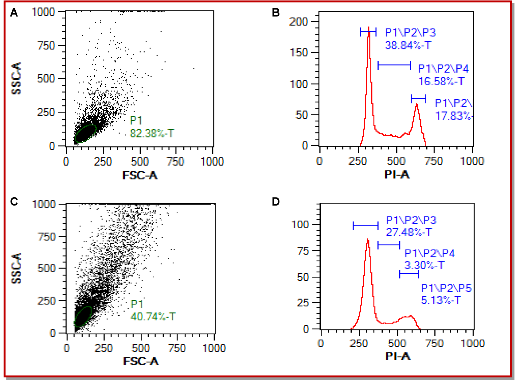 Figure 7: Cell cycle analysis of the HeLa cells. A and B: control HeLa cells. C and D: HeLa treated with bioactive fraction 2