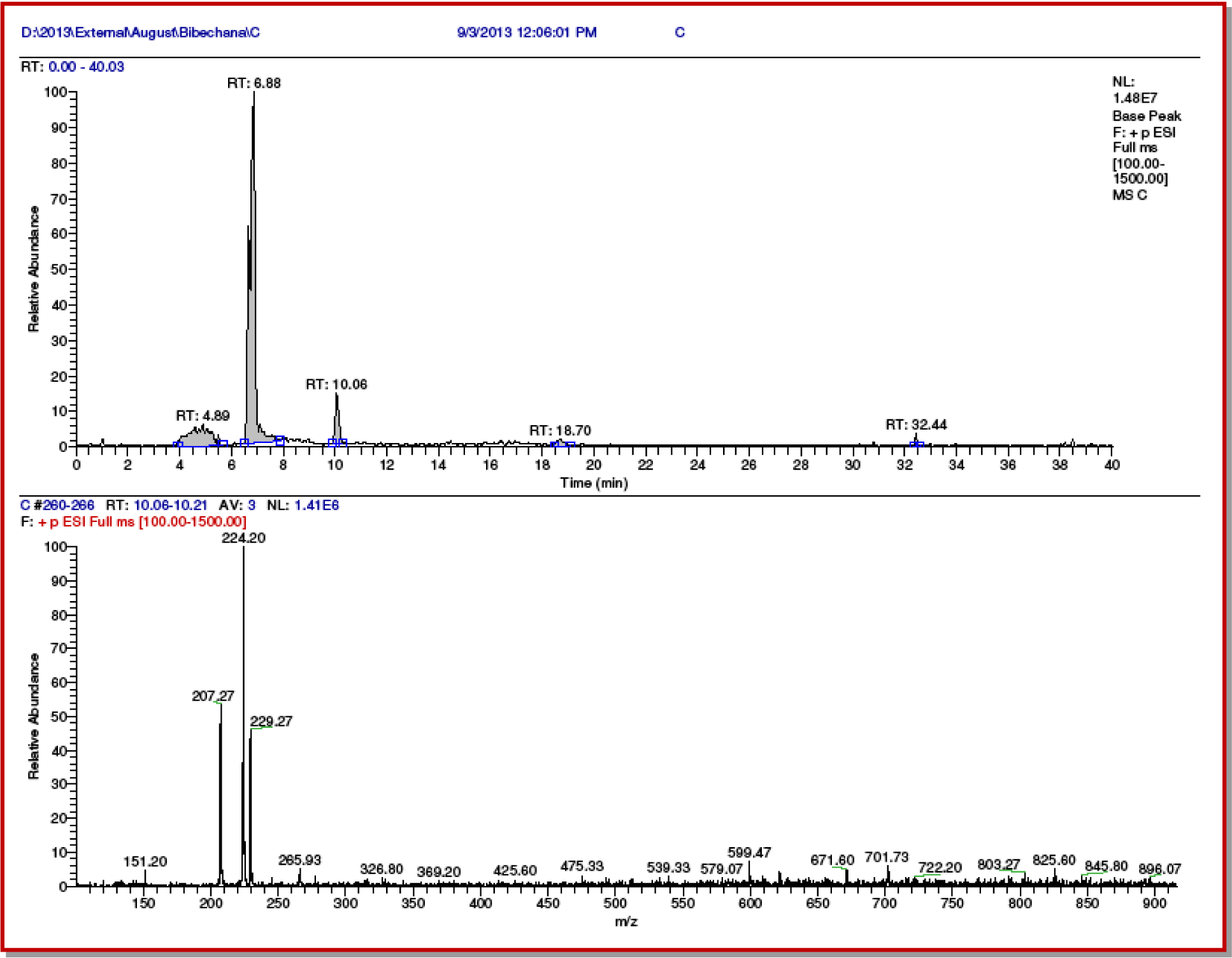 Figure 8: LC-MS analysis of TLC purified fraction 2 of banana flower extract Upper panel: HPLC chromatogram of fraction 2 showing 3 peaks. Second peak was largest at RT 6.88 min.; Lower panel: LC-MS spectra of the second fraction, m/z 224.20