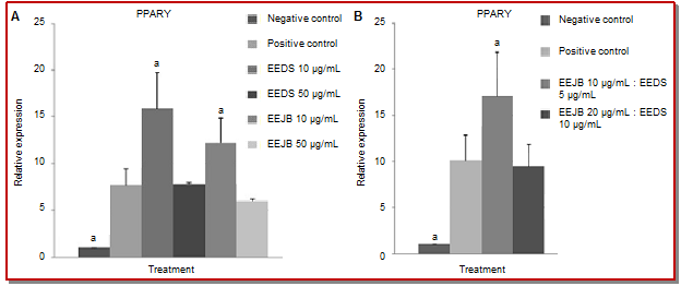 The quantification of PPAR-gamma gene expression using qPCR revealed that only several treatments than positive control, which were EEJB 50 µg/mL and combination of EEJB and EEDS (20 µg/mL, 10 µg/mL) (Figure 1). The lowest expression of PPAR-gamma gene was found in 3T3-L1 cells treated with EEJB 50 µg/mL, while the highest expression of PPAR-gamma gene was found in 3T3-L1 cells treated with combination of EEJB and EEDS (10 µg/mL, 5 µg/mL).