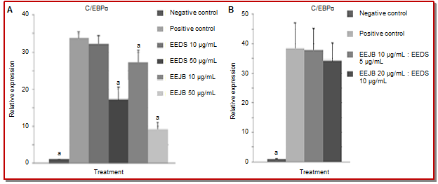 All 3T3-L1 cells treated with the EEJB and/or EEDS were found to express C/EBP-alpha mRNA lower than positive control, but the all combination of extracts treatments did not able to reduce the expression significantly (Figure 2). EEJB 50 µg/mL was the most active to reduce C/EBPα gene expression, whilst the combination of EEJB and EEDS (10 µg/mL, 5 µg/mL) was the least active.