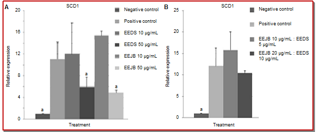 In this research, EEJB and EEDS at the concentration of 50 µg/mL showed lower SCD1 gene expression by approximately twice than positive control (Figure 3). EEJB at the concentration of 50 µg/mL was able to reduce SCD1 gene expression the most, with relative expression value of 4.9. Meanwhile, the combination of EEJB and EEDS (10 µg/mL and 5 µg/mL) resulted in highest SCD1 gene expression, with relative expression value of 15.8.