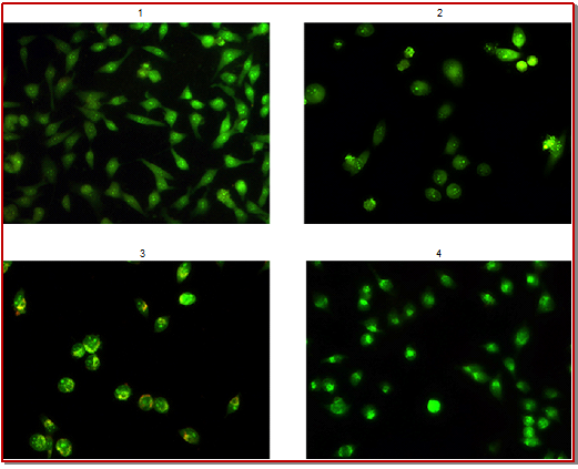 Figure 1: Photomicrographs of acridine orange/ethidium bromide stained HeLa cells (A): 1-control HeLa cells, 2- HeLa cells treated with cisplatin, 3- HeLa cells treated with water extract of M. aquifolium, 4- HeLa cells treated with ethanol extract of M. aquifolium