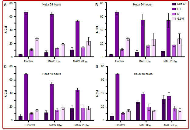 Figure 2: Changes in the cell cycle phase distribution of HeLa cells induced by M. aquifolium extracts after 24 (A, B) and 48 hours (C, D) of treatment