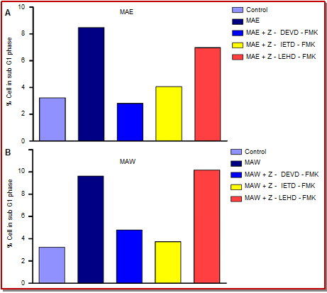 The presence of caspase-3 and caspase-8 inhibitors notably decreased percentages of apoptotic cells in the sub G1 phase treated with water or ethanol extract (Figure 3).