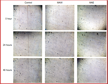 Figure 4: Effects of Mahonia aquifolium water (MAW) and ethanol (MAE) extracts on endothelial cell migration. Applied concentrations for MAW was 79.7 µg/mL for MAE was 48.26 µg/mL. Representative photomicrographs of one out of three independent experiments are shown