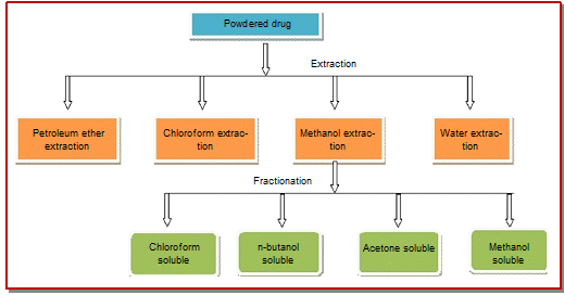 The dried powdered plant material was successively extracted with various solvents like petroleum ether (40-60°C), chloroform, methanol and water. The four successive extracts, thus, obtained were labeled as petroleum ether extract (PE), moderately polar chloroform (SCH), polar methanol (MEE) and aqueous extract (SAE). The chemical profile of plant revealed the presence of secondary metabolites such as steroids, flavonoids, alkaloids, triterpenoids and phenolics which were identified with the help of general chemical tests (Khandelwal and Sethi, 2010).