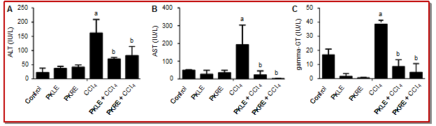 Figure 1: ALT (A), AST (B) and GGT (C) values of different groups; Data is represented as Mean ± SD; "a" Shows significant difference Vs Control Group; "b" Shows significant difference Vs CCl4 Group