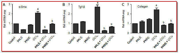 Figure 2: mRNA expression values of alpha- Smooth muscle actin (A), transforming growth factor-beta (B) and collagen (C); Data is represented as Mean ± SD; “a†Shows significant difference Vs Control Group. "b" Shows Significant difference Vs CCl4 Group