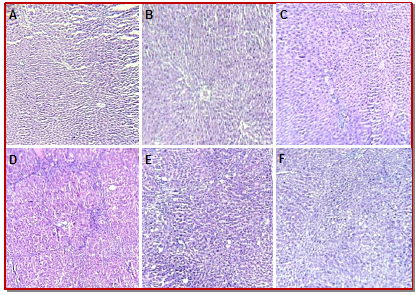 Figure 3: Microscopic evaluation of H & E stained liver tissue. Representative of n=5 from each group. A: Corn oil treatment, B: Corn oil + leaf extract (500 mg/kg), C: Corn oil + rhizome extract (500 mg/kg) D; CCL4 treated, E: CCL4 + leaf extract 500 mg/kg, F: Corn oil+ rhizome extract 500 mg/kg