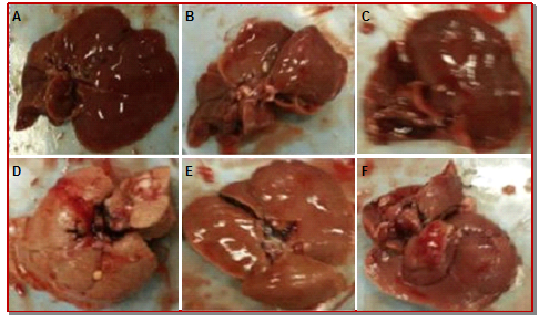 Figure 4: Gross appearance of livers. Excised livers from the treated animals after dissection and photographed. Representative of n=5 from each group. A: Corn oil treatment, B: Corn oil + leaf extract (500 mg/kg), C: Corn oil + rhizome extract (500 mg/kg) D: CCL4 treated, E: CCL4 + leaf extract 500 mg/kg, F: Corn oil+ rhizome extract 500 mg/kg