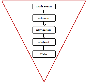 The crude methanol extract was separated into two parts. One part (10 g) was stored in a glass vial to be tested as crude methanolic extracts for antifungal and antioxidant activities while the other part (92 g) was dissolved in 300 mL of water, transferred to a separating funnel to obtain the fractions of the crude extract. An equal volume of analytical grade n-hexane was poured into the separation funnel, gently upset it, and then keeps it undisturbed for a moment to separate the two layers. The upper layer of n-hexane fraction of the crude extract was collected in the flask and the lower aqueous phase was re-extracted thrice with n-hexane. All the quantities of n-hexane fraction were combined and dried in a rotary evaporator. The n-hexane extract was completely dried in a desiccator at about 40ºC and kept in glass vials until used. The same method of fractionation was also applied to other solvents (ethyl acetate and n-butanol). The water phase at the end of the fractionation method was dried via rotary evaporator and desiccator and used as water fraction (Bakht et al., 2011c).