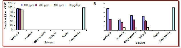 The antioxidants of the plant source have good impact on the human health and reduce the risk of diseases (Gulcin et al., 2003). The frequency of cancer and cardiovascular diseases can effectively lower with the use of plant-derived antioxidants (Arabshahi and Urooj, 2007). Extraction of antioxidant depends on the nature of extracting solvent. Thus, preliminary screening is necessary to pinpoint the favorable solvents that finalize the optimum antifungal and radical scavenging activity for the extracts.